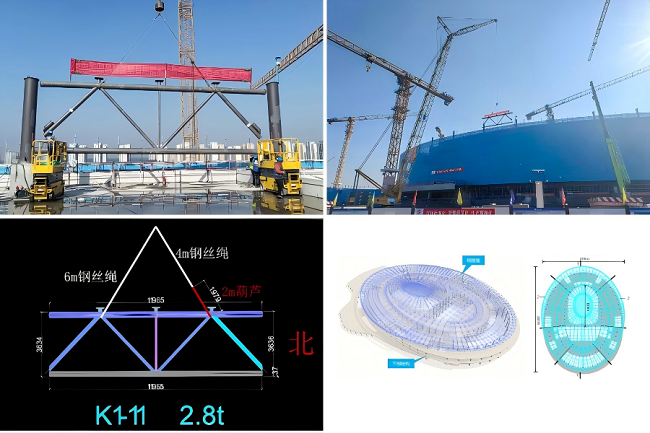 本次首吊的鋼桁架位于屋蓋起始安裝區(qū)域,單榀重量2.8噸。面對屋蓋結構面積大、體量大、跨度大,構件節(jié)點三維坐標精確定位難等挑戰(zhàn),集團建設團隊創(chuàng)新采用“地面拼裝、整榀吊裝”方案,多臺大型起重機械協(xié)同作業(yè)。同時,通過強化計算分析、嚴控拼裝精度、精準測量定位、嚴把焊接質量,確保吊裝安全與施工質量雙可控,助力實現(xiàn)首吊圓滿成功。